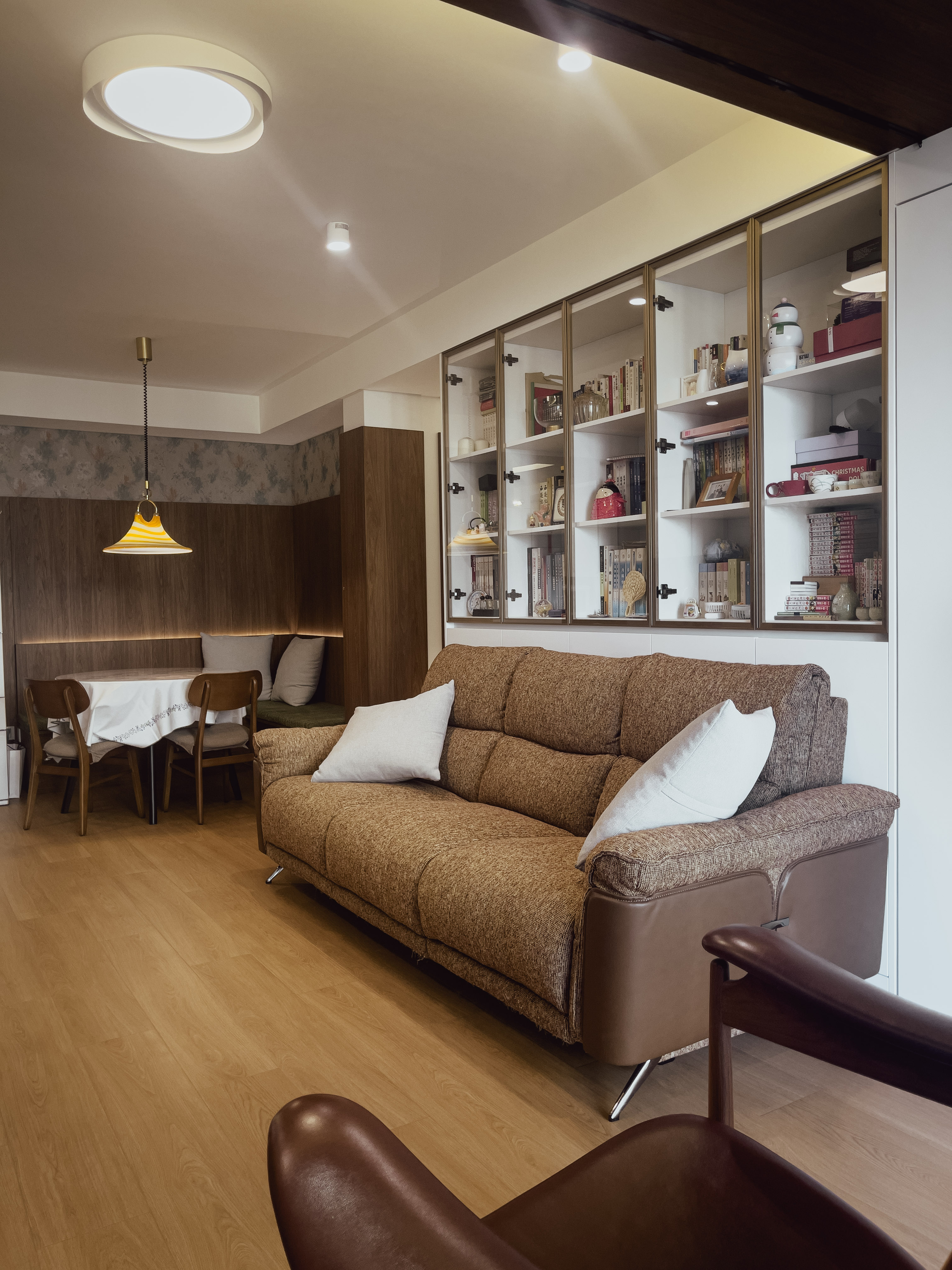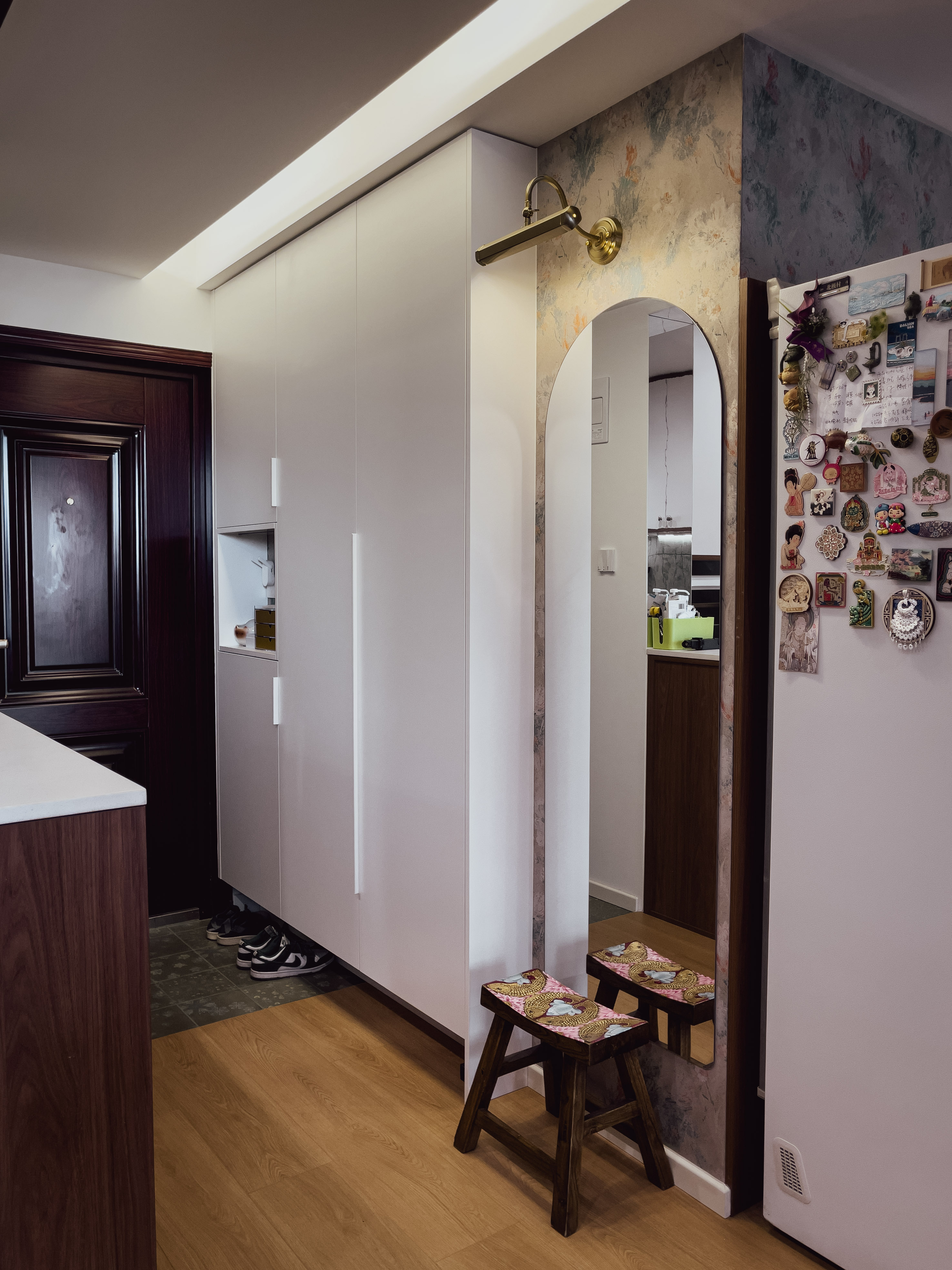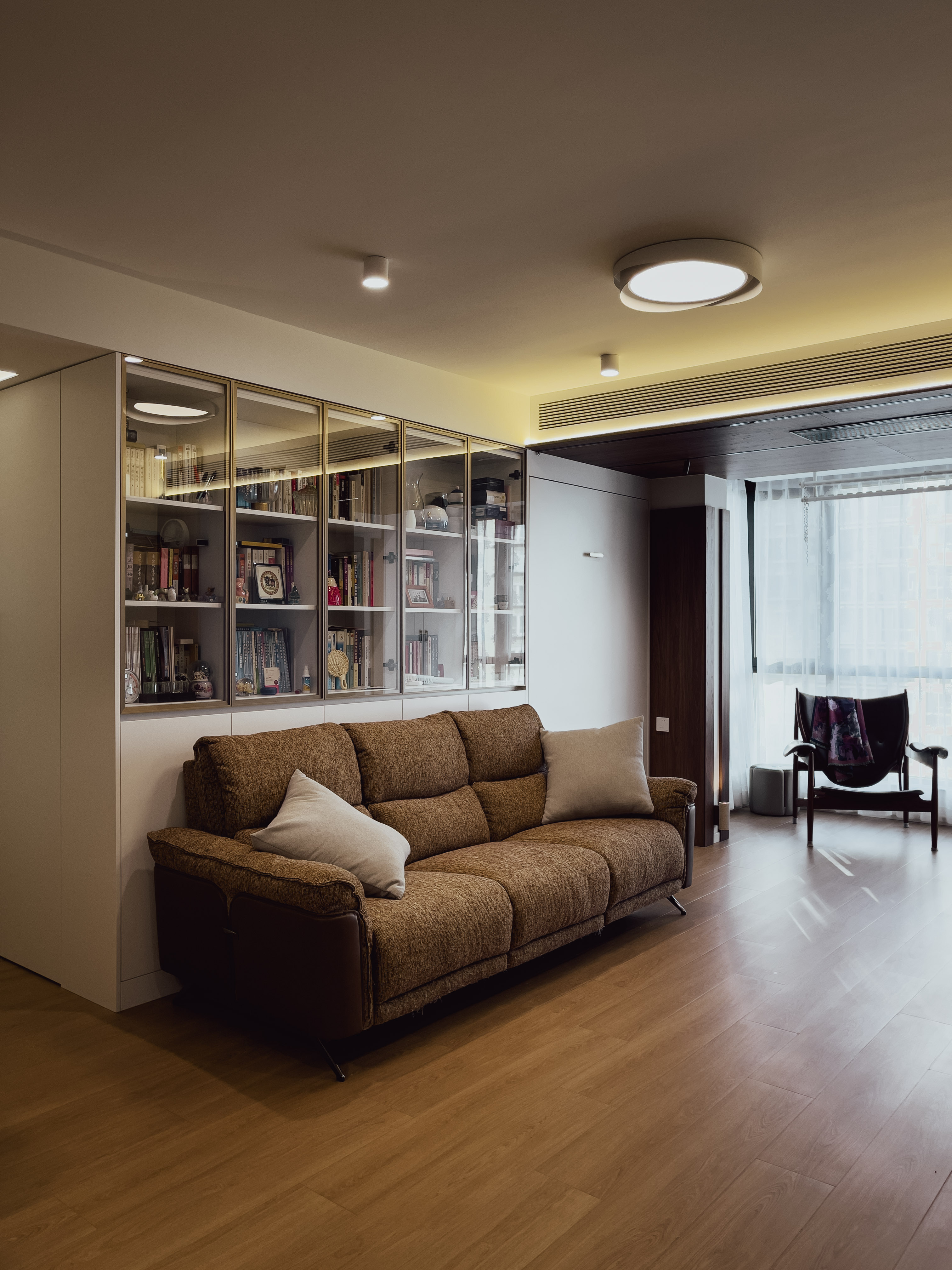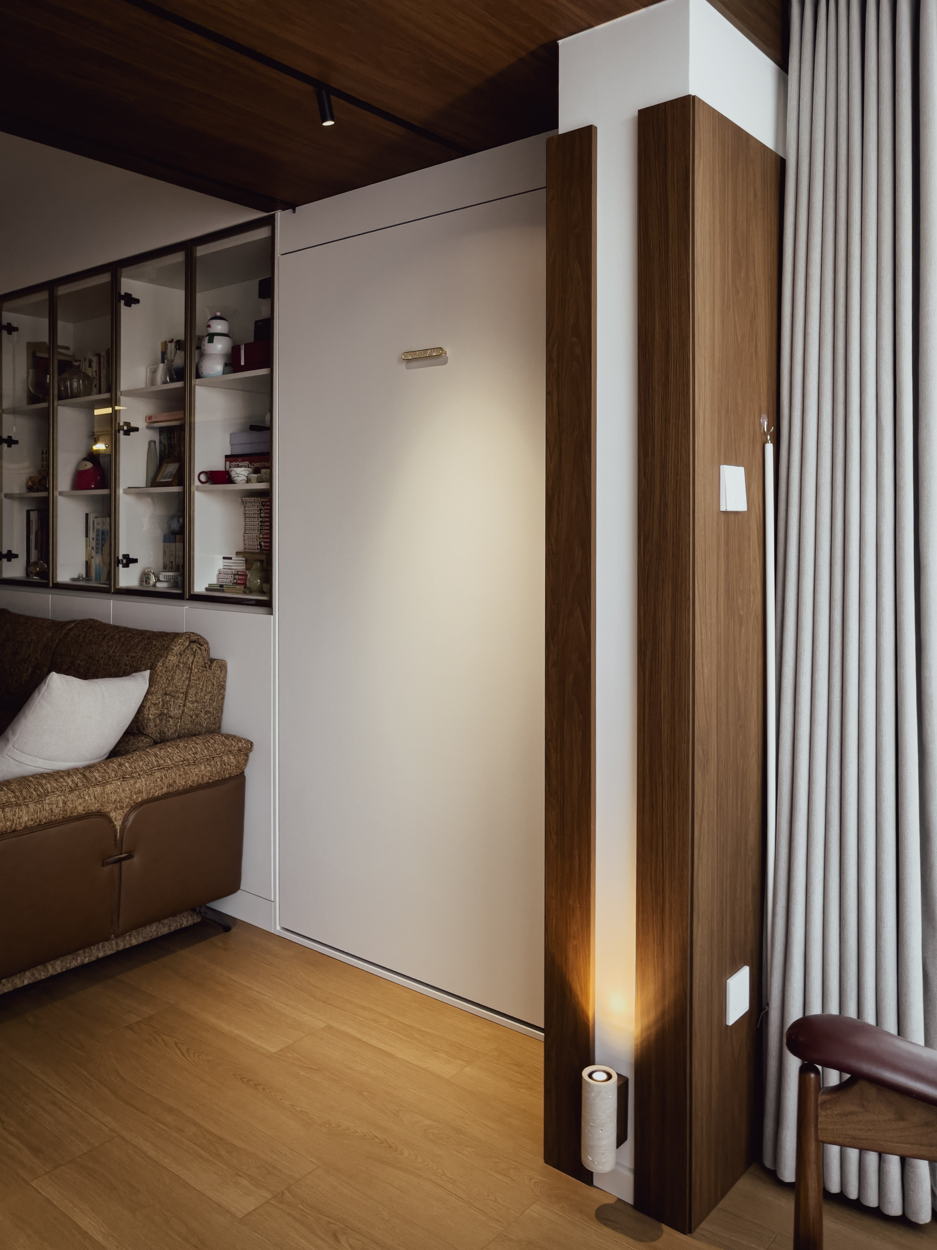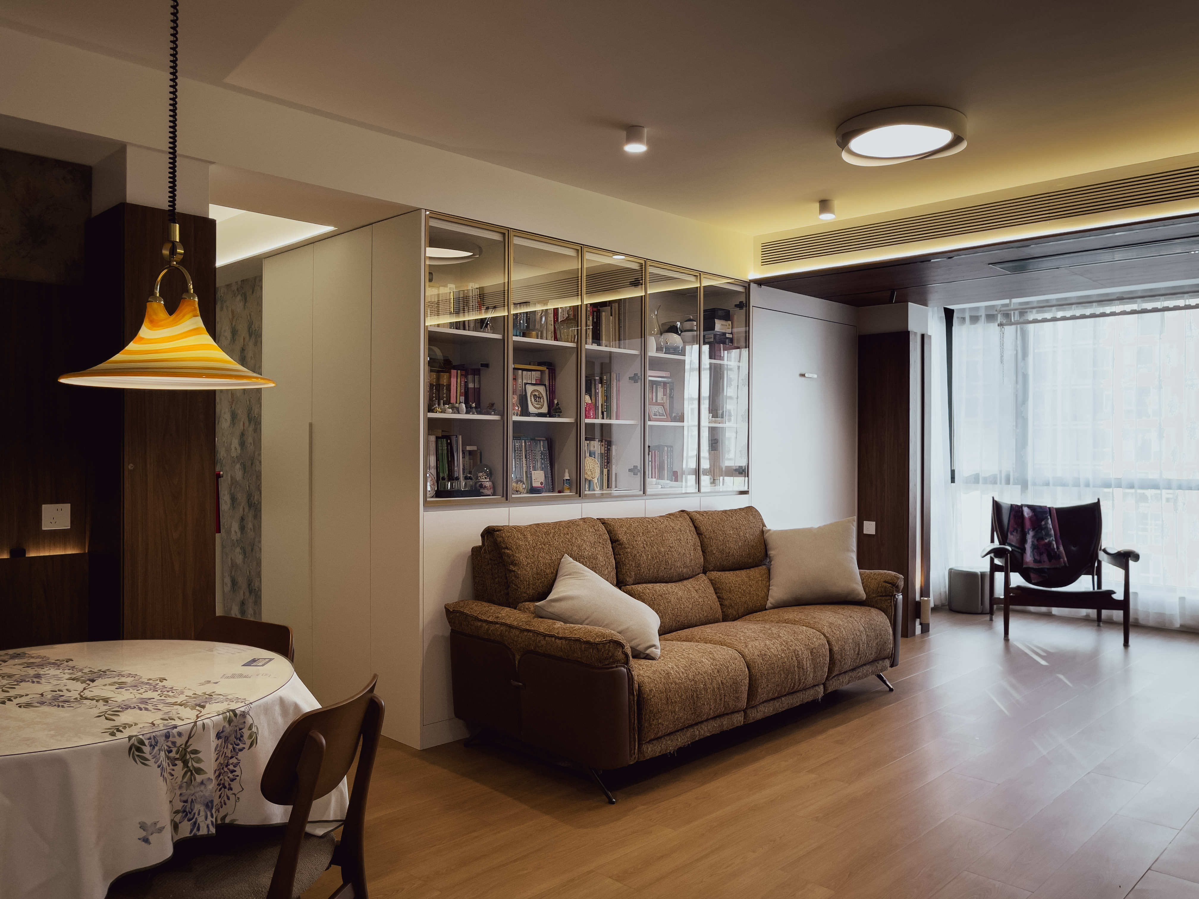 本项目全屋朝北,自然采光有限。我们通过中古风的暖色调、巧妙的灯光设计、镜面反射等手段,将这个"先天不足"的户型打造成了优雅恬静的居住空间。