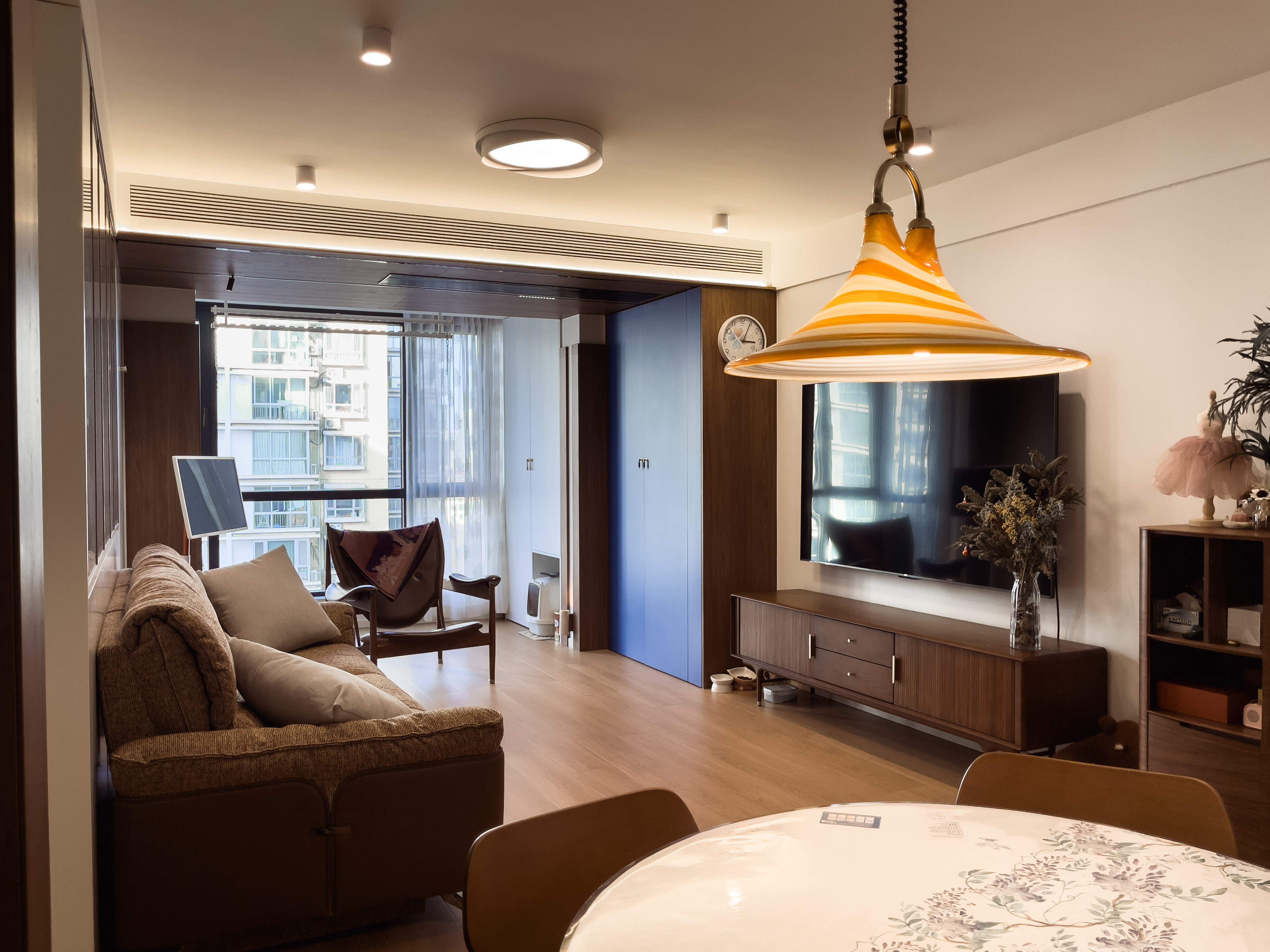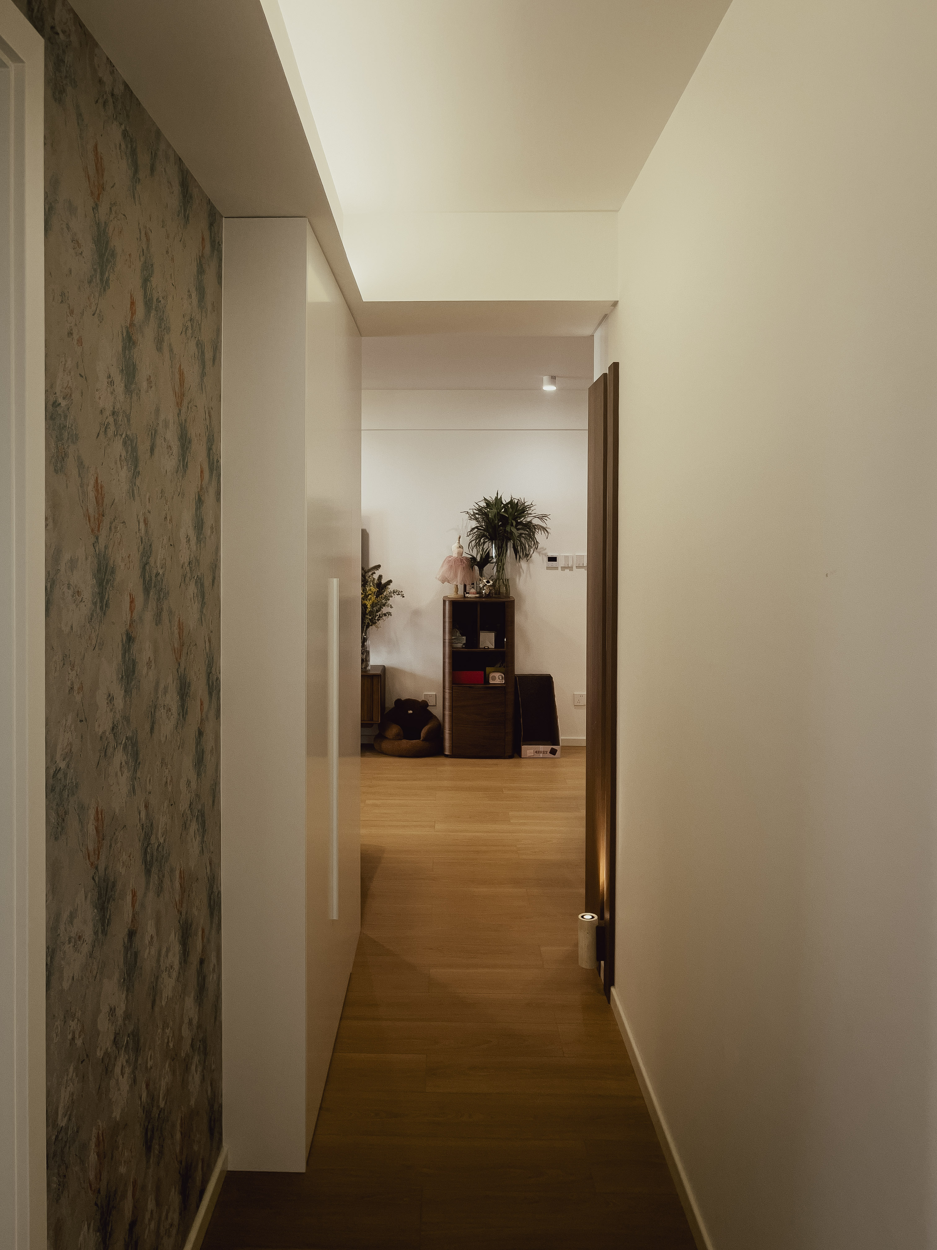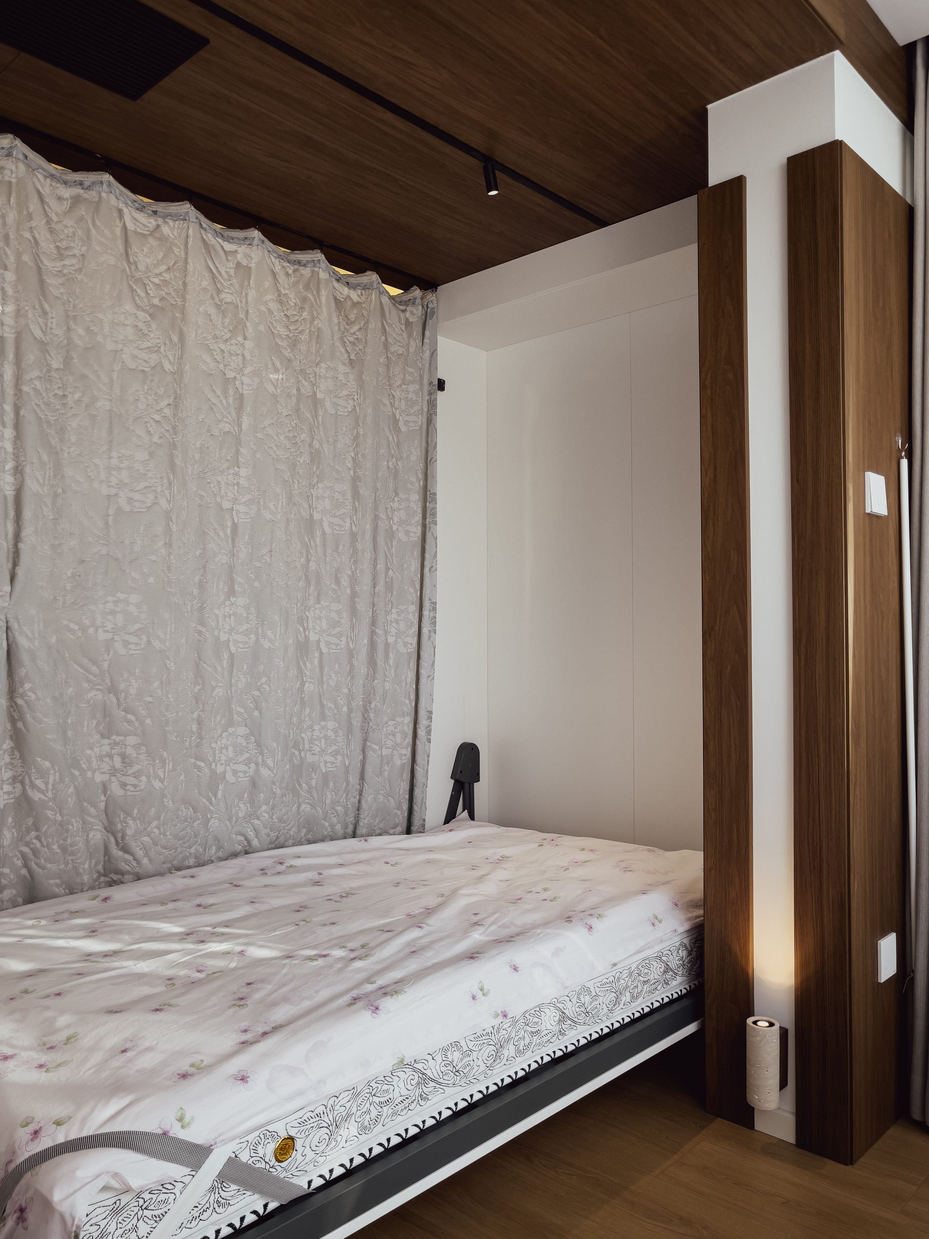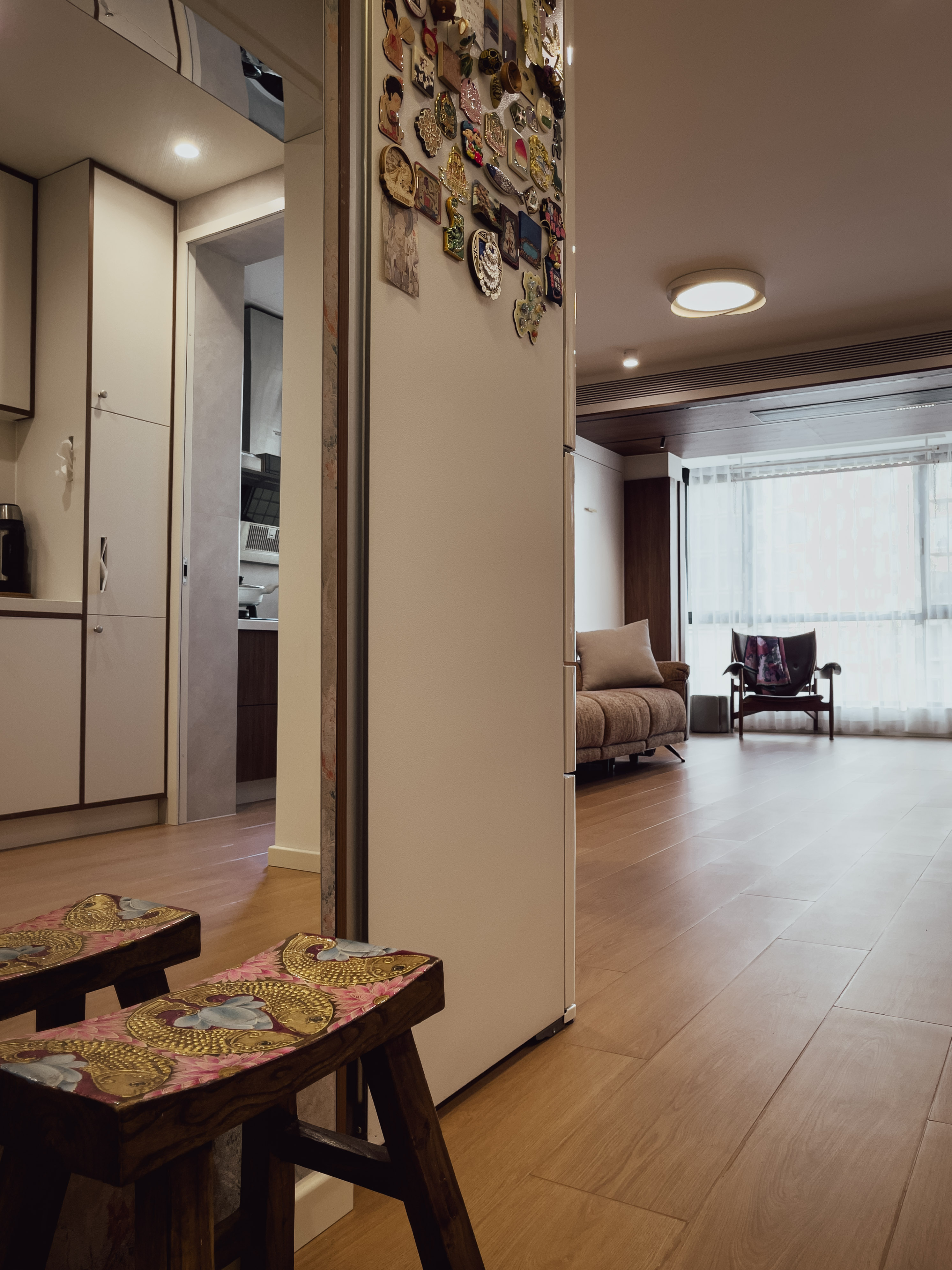 本项目全屋朝北,自然采光有限。我们通过中古风的暖色调、巧妙的灯光设计、镜面反射等手段,将这个"先天不足"的户型打造成了优雅恬静的居住空间。
