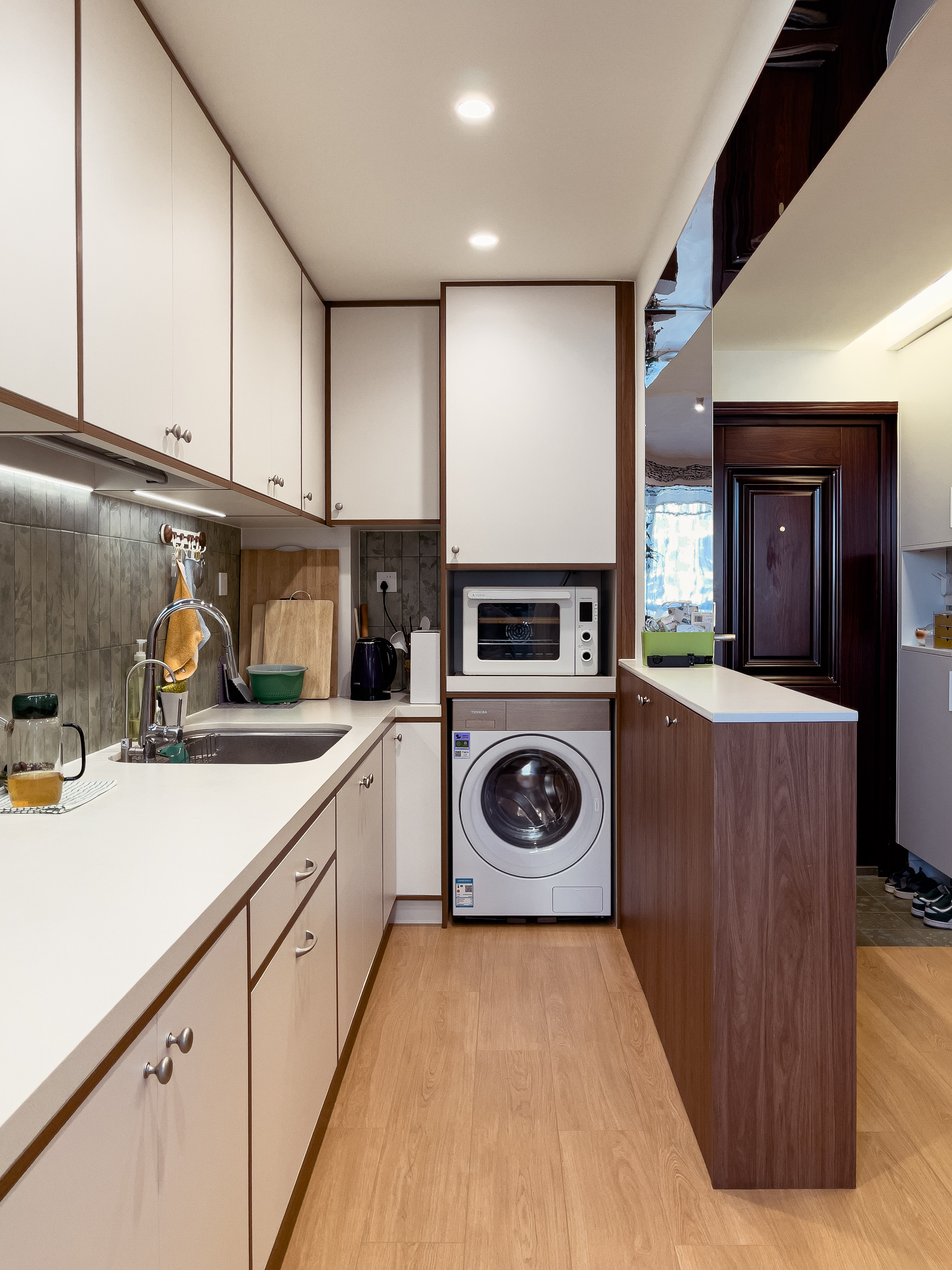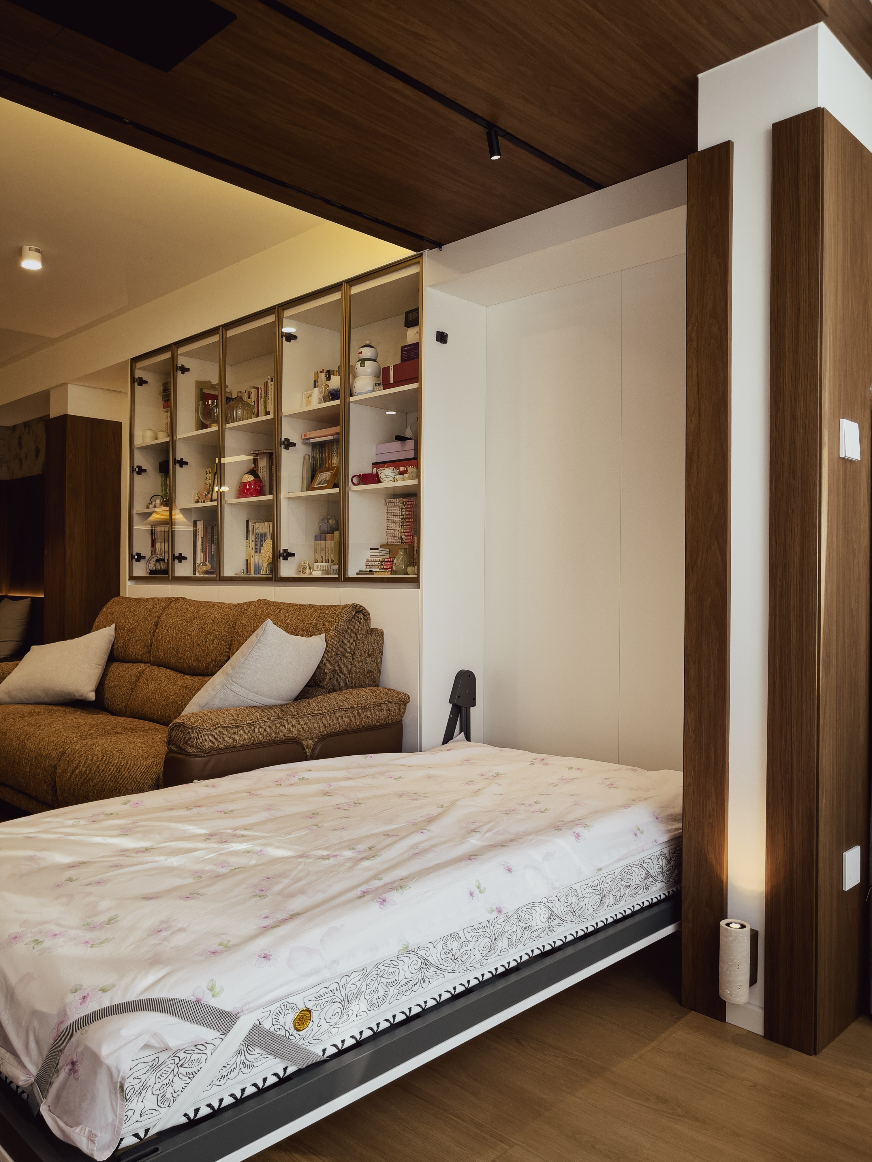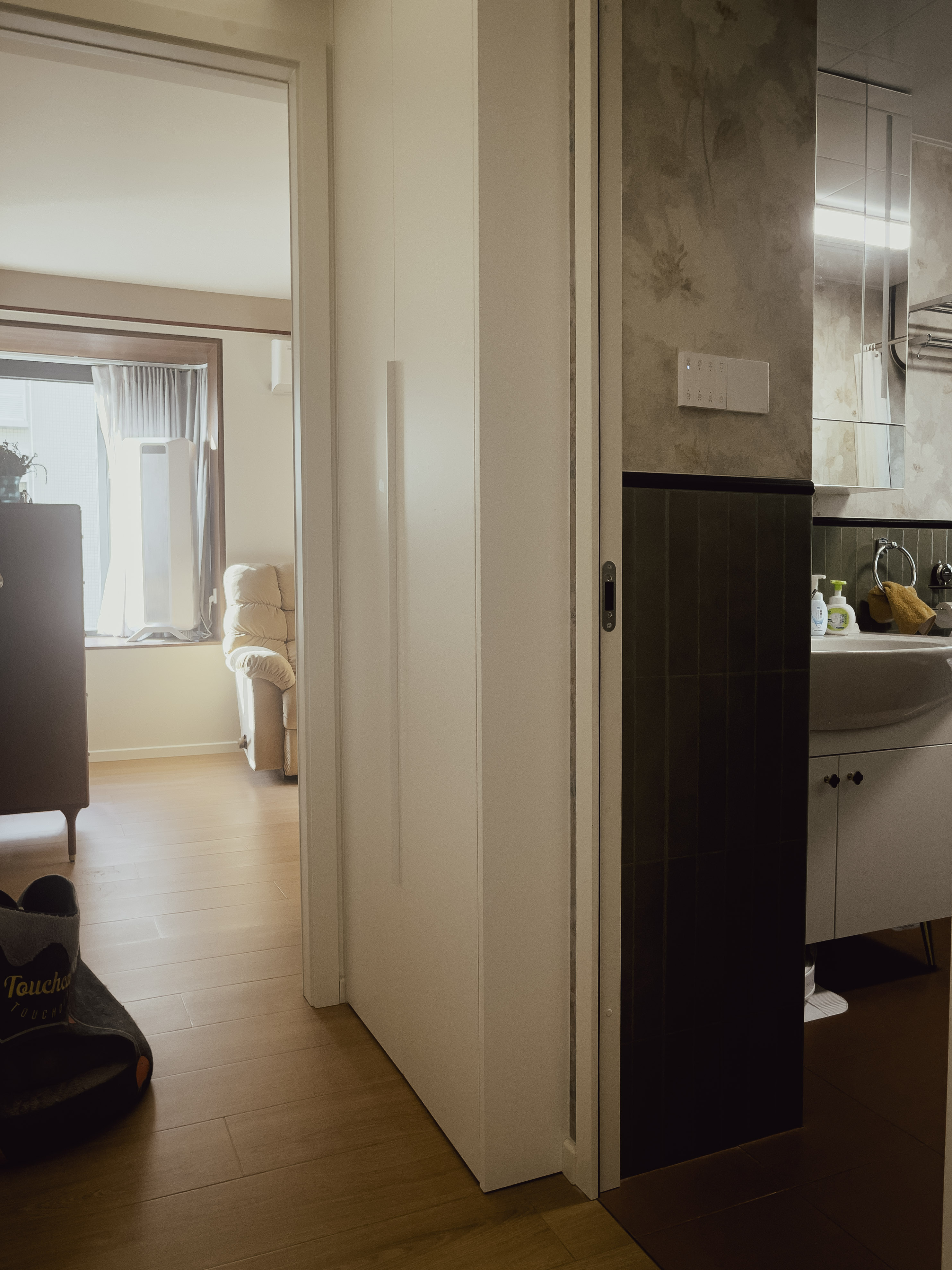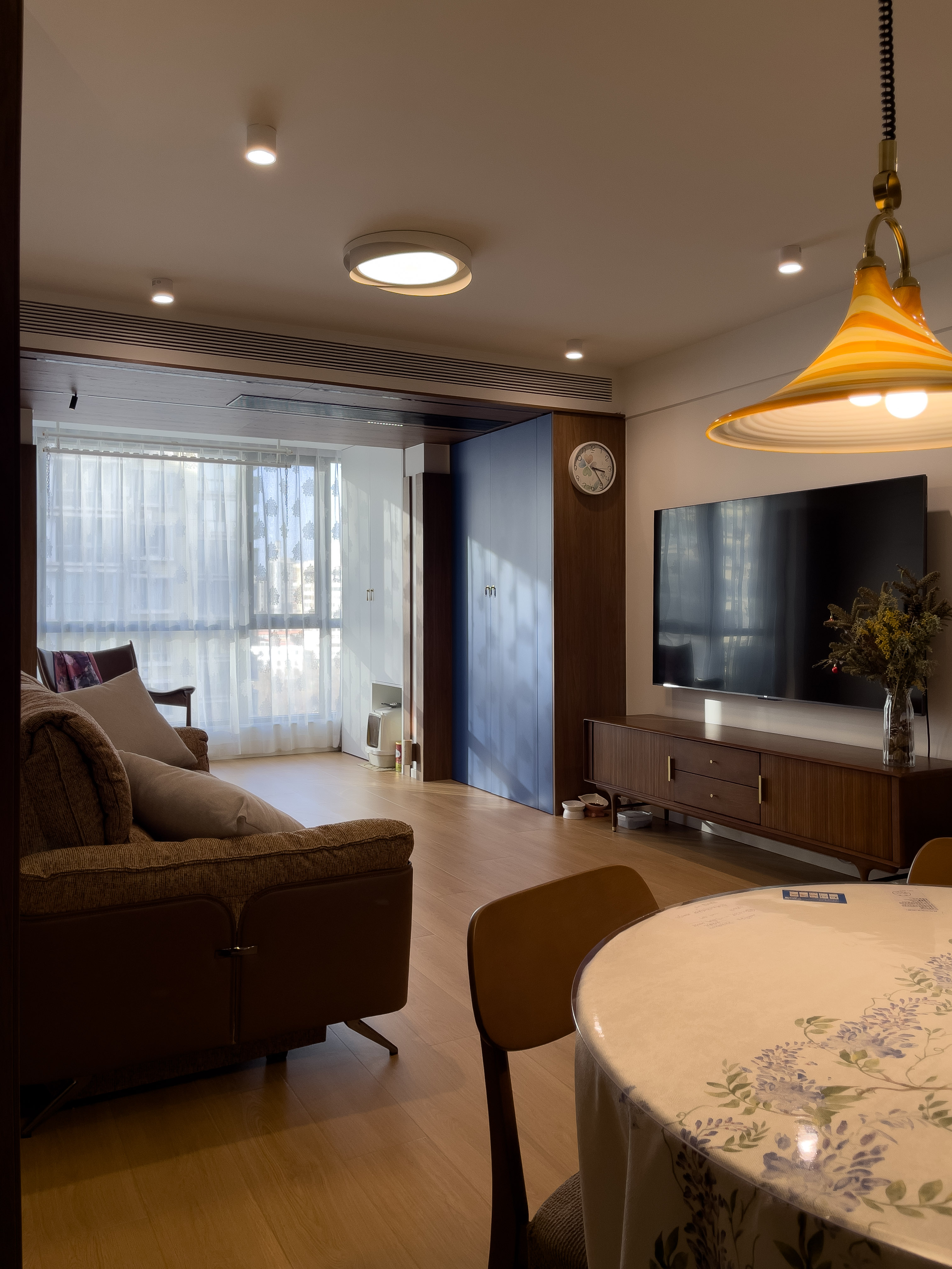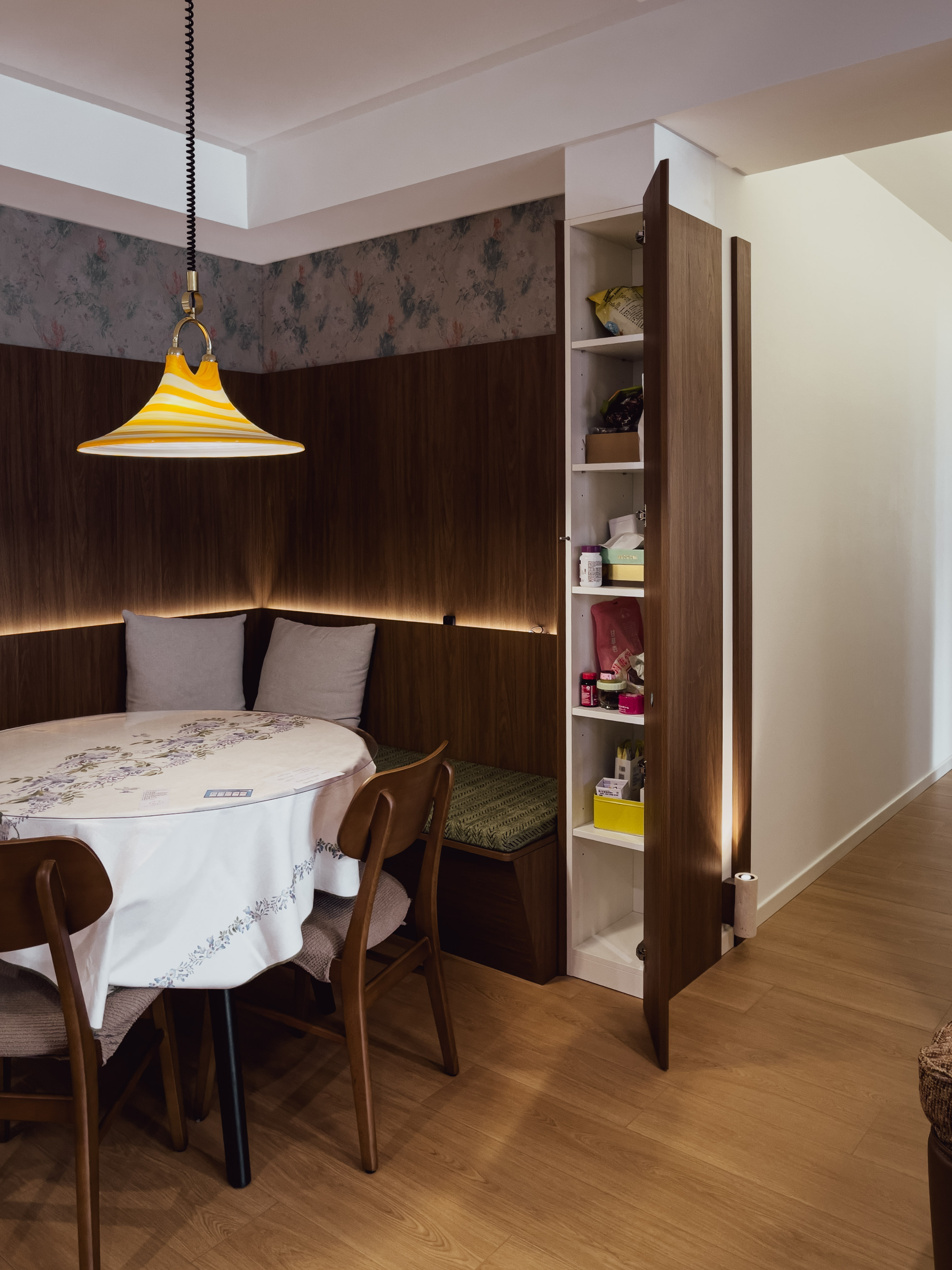 本项目全屋朝北,自然采光有限。我们通过中古风的暖色调、巧妙的灯光设计、镜面反射等手段,将这个"先天不足"的户型打造成了优雅恬静的居住空间。