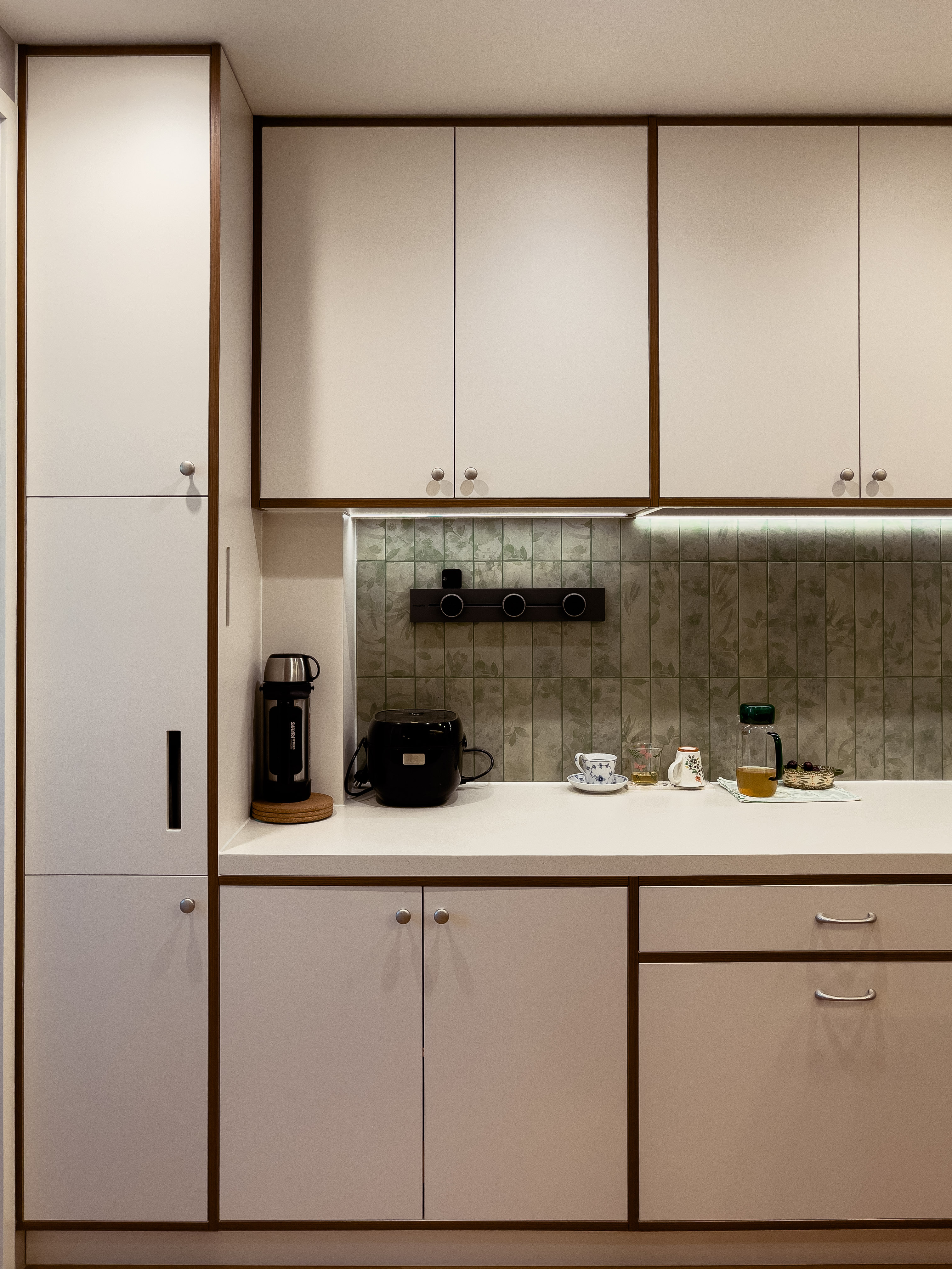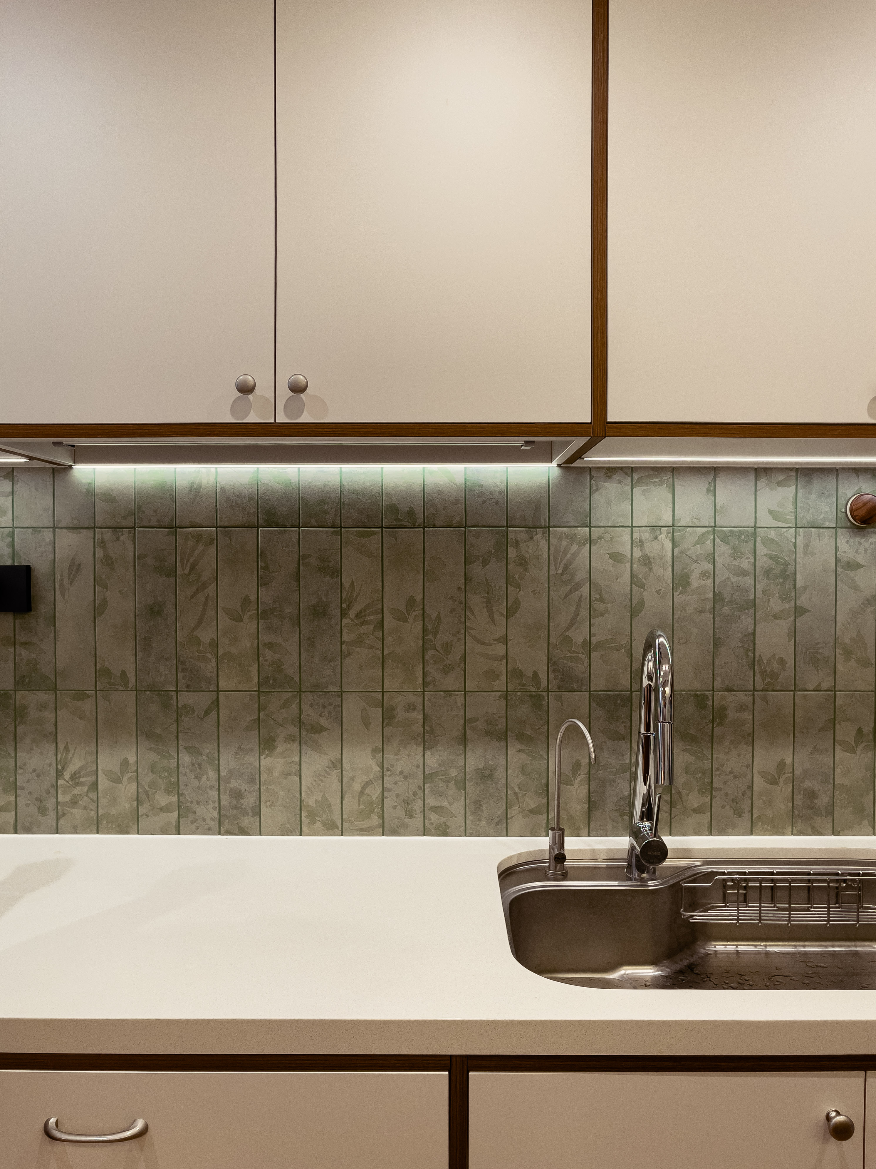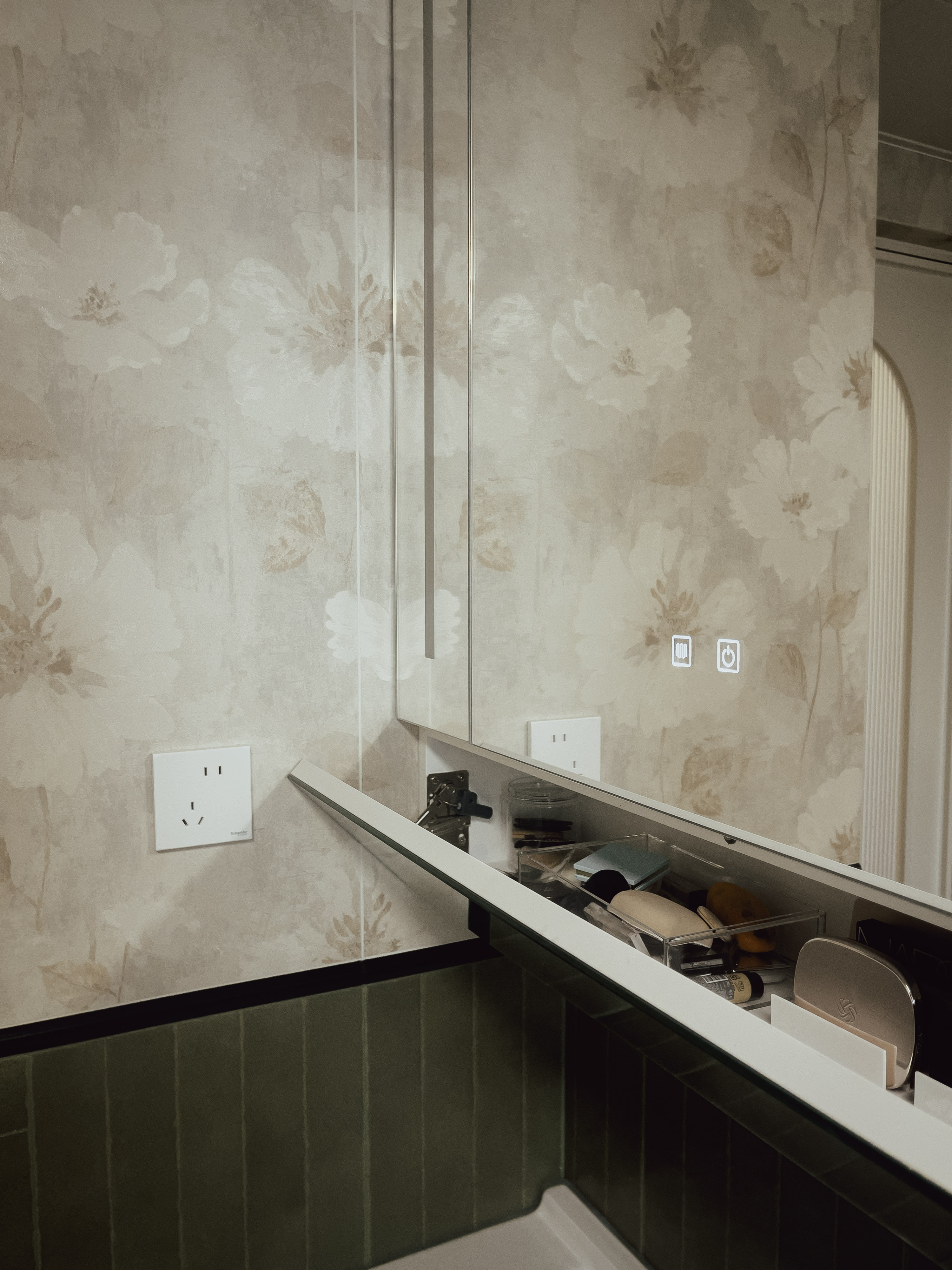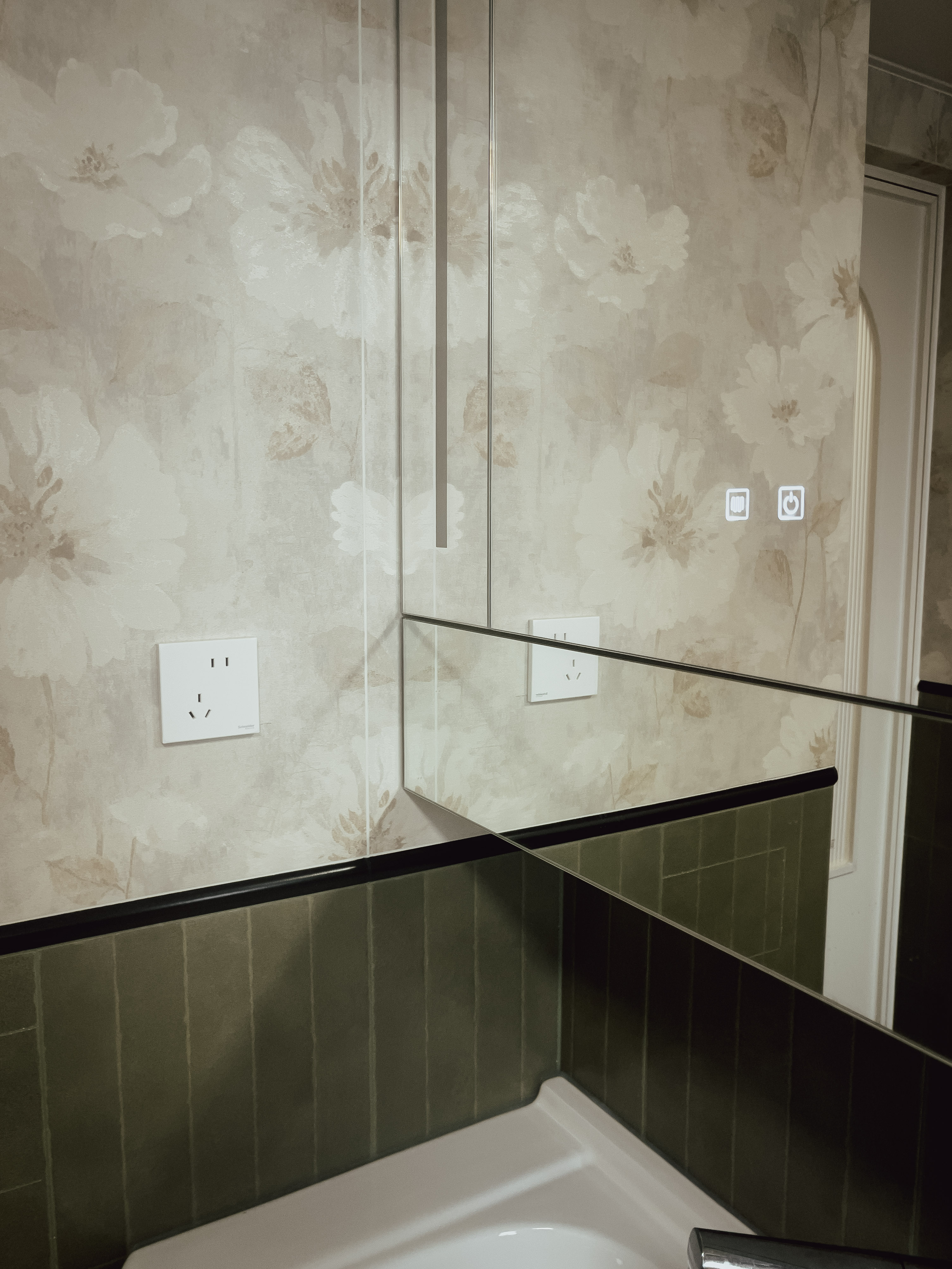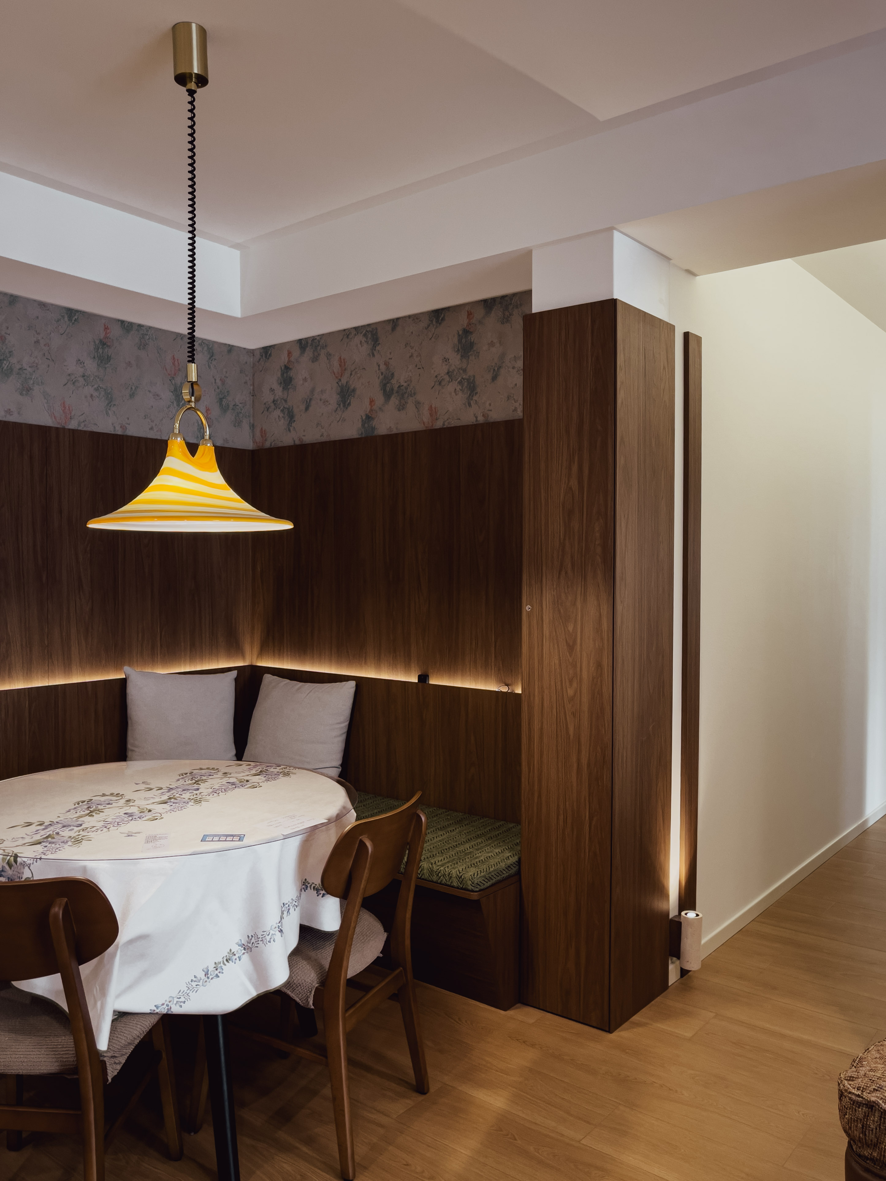 本项目全屋朝北,自然采光有限。我们通过中古风的暖色调、巧妙的灯光设计、镜面反射等手段,将这个"先天不足"的户型打造成了优雅恬静的居住空间。